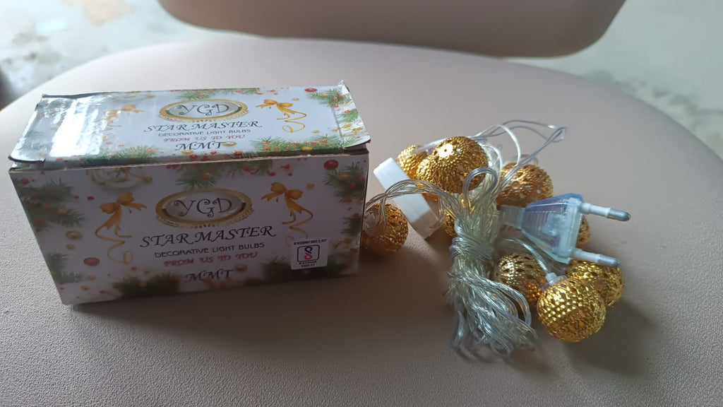 LED string lights , decorative string lights , fairy lights , festival lights , party lights, decorative lighting , home decoration , diwali decoration , balcony lighting , golden ball string lights , metallic ball string lights , festive decorative lights